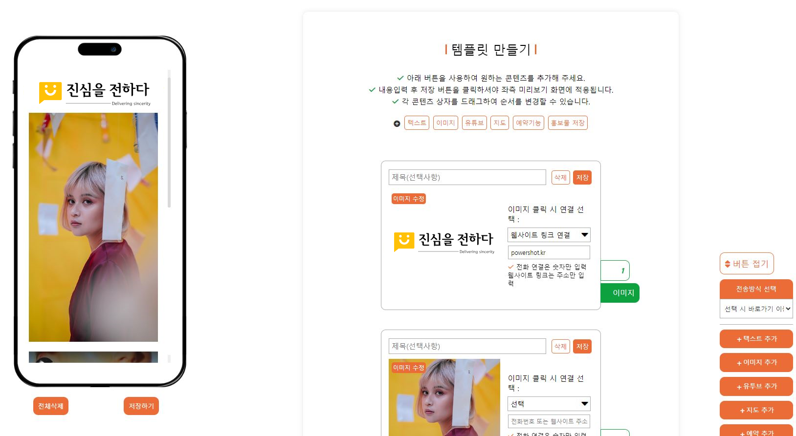 터치 시 URL 링크 연결(웹사이트 이동) · 전화걸기 등 다양한 동작이 가능한 버튼 제공